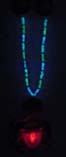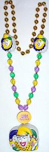 A show-stopper at night! The medallion lights up, and so do the beads! SEE IT IN ACTION BELOW! The large plastic jester medallion on the bottom of the beads flashes red, while the transluscent purple, green & yellow beads in the middle section look as though electricity is shooting through them. Two smaller plastic jesters (these don't light up) separate the flashing beads from the gold metallic beads which will go around the back of your neck. The jester medallion hangs from the power mechanish which is imprinted with the words "2001 Mardi Gras".